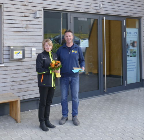 Andreas Chalupa gratuliert Martina Bayer, verantwortlich für die Buchhaltung bei Chalupa Solartechnik, zu ihrem 10-jährigen Arbeitsjubiläum.